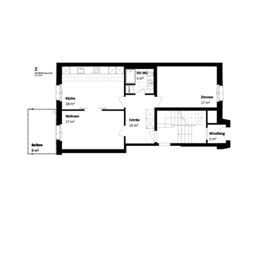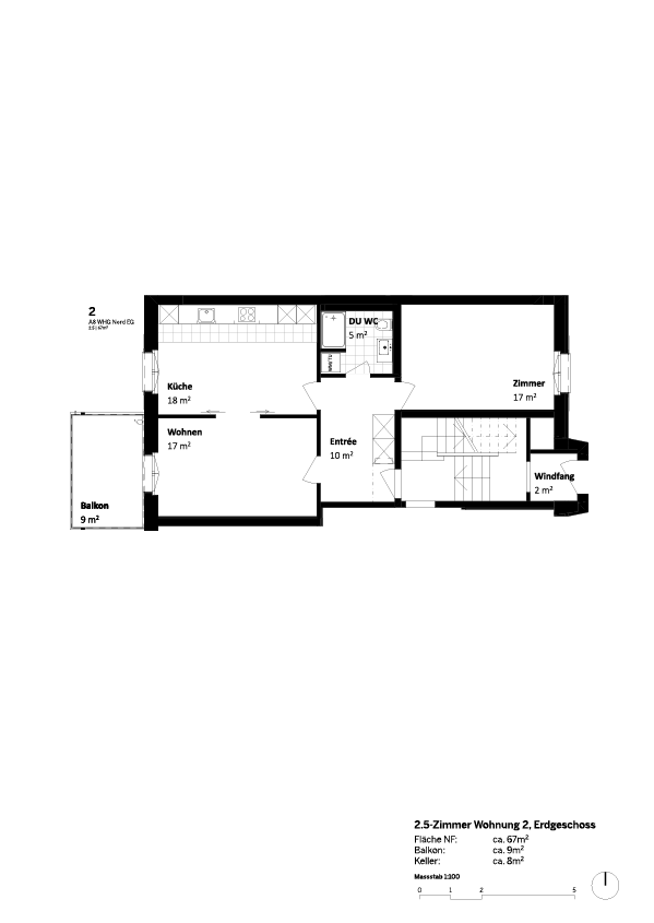 Im nördlichen Hochparterre befindet sich eine der grosszügigen 2.5-Zimmerwohnungen, die eigentlich einer 3-Zimmerwohnung entspricht. Die Wohnküche lässt sich mittels stilvollen Schiebetüre zum Wohnzimmer hin öffnen. Dank dem speziellen Design ohne Oberbauten lässt sich die Küchenzeile perfekt in den Wohnraum integrieren. Im grosszügigen Korridor hält ein Einbauschrank Stauraum bereit. Im Bad sind Dusche, Glastrennwand und Waschturm praktisch und schön zugleich.