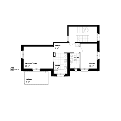 Die 2.5-Zimmerwohnung im 1. OG Süd bietet eine teilweise zum Korridor und Wohnzimmer hin offene Küche. Das Tageslichtbad mit Dusche/WC ist stil- und stimmungsvoll, der kleine Einbauschrank im Korridor praktisch. Die Wohnung hat einen Balkon vor dem Wohnzimmer mit offenem Blick Richtung See.