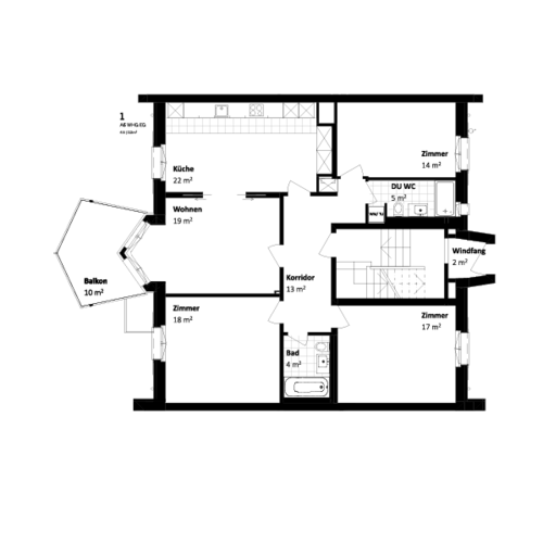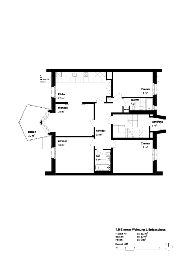 Die 4.5-Zimmerwohnung im Hochparterre hat einen stilvollen Erker im Wohnzimmer mit Ausgang auf den trapezartigen Balkon. Die Wohnküche lässt sich durch leichte stilvolle Schiebetüren mit dem Wohnzimmer verbinden. Die hellen Bäder werden mit Badewanne/WC und separater Tageslicht-Dusche/WC und Waschturm zum Wohlfühlort. Stauraum bietet der Korridor mit Einbauschrank.
